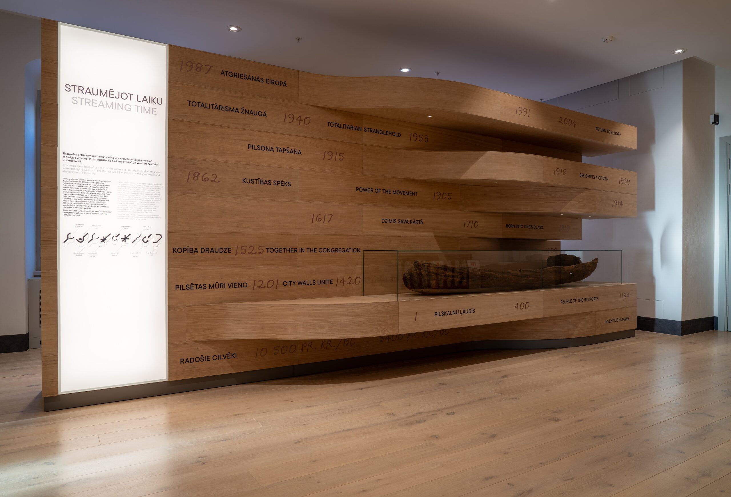 Ekspozīcijā Latvijas vēstures 12 500 gadi dalīti deviņās tēmās: Radošie cilvēki, Pilskalnu ļaudis, Pilsētas mūris vieno, Kopība draudzē, Dzimis savā kārtā, Kustības spēks, Pilsoņa tapšana, Totalitārisma žņaugā, Atgriešanās Eiropā. Katrai no tēmām rasts savs arhitektoniskais veidols – skulptūrveida stends –, kas kopā veido neparastu formu virkni, caur kuru kā līkumotu laika upi iziet apmeklētājs.